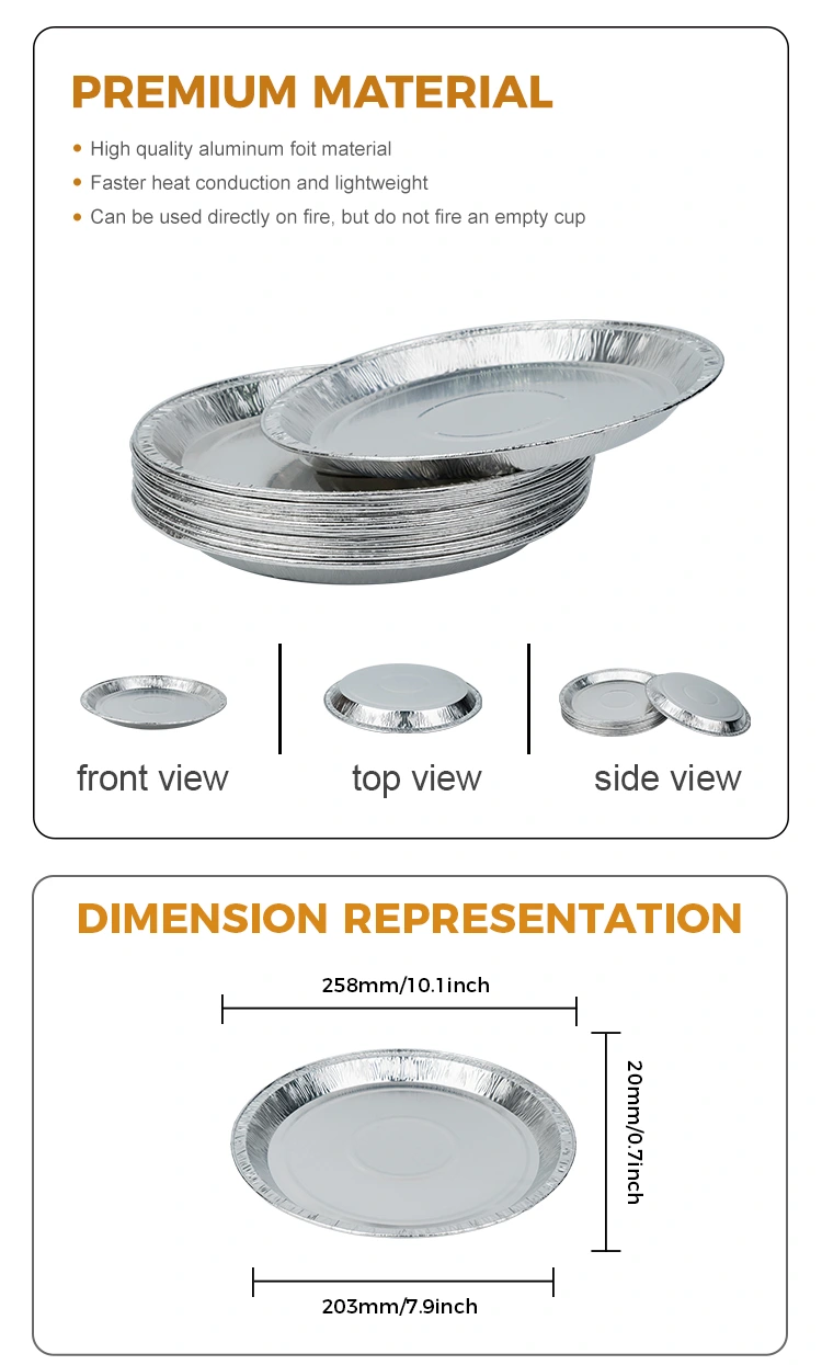 यंचू uminum ल्युमिनियम फॉइल मॉडेल क्रमांक 13110 सह 10 इंच पिझ्झा पॅन सिल्व्हर अ‍ॅल्युमिनियम फॉइल कंटेनर देते. उत्पादनाचा वरचा व्यास 258 मिमी (सुमारे 10.1 इंच), 203 मिमी (सुमारे 7.9 इंच) आणि 20 मिमी उंची (सुमारे 0.7 इंच) आहे. अंदाजे 695 मिली (सुमारे 24.5 औंस) क्षमतेसह, हे चिकट न करता पिझ्झा बेकिंगसाठी योग्य आहे, साच्यातून सोडणे सोपे आहे आणि त्याला गंध नाही. याव्यतिरिक्त, त्याची वाढलेली धार डिझाइन घटकांना गळतीपासून प्रतिबंधित करते आणि व्यावहारिकता वाढवते. आपल्या ग्राहकांची छाप आणखी खोल करण्यात आणि आपली ब्रँड जागरूकता वाढविण्यात मदत करण्यासाठी आम्ही लोगो सानुकूलित सेवा देखील प्रदान करू शकतो.
