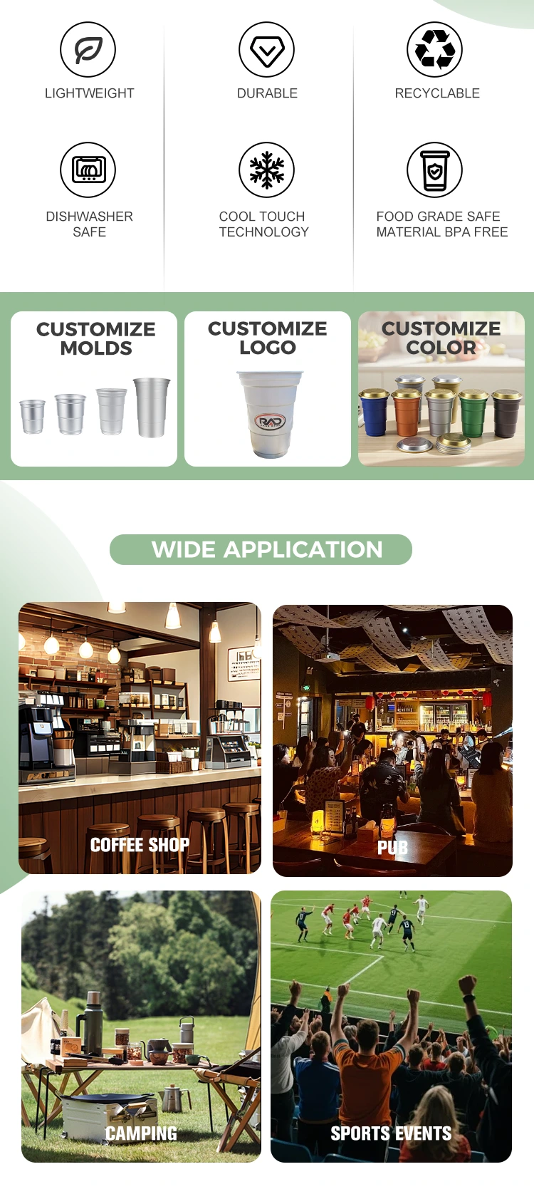 हा 16oz डिस्पोजेबल कस्टम ॲल्युमिनियम फॉइल बिअर आणि कॉफी ड्रिंक कप थेट रेफ्रिजरेटरमध्ये रेफ्रिजरेटरमध्ये ठेवता येतो. थंड पेये साठवताना, ॲल्युमिनियम सामग्रीची उष्णता चालकता थंड तापमान राखण्यास मदत करते.