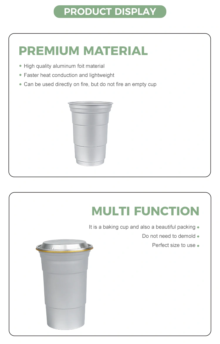हे गरम पेय साठवण्यासाठी देखील वापरले जाऊ शकते. 16oz डिस्पोजेबल कस्टम ॲल्युमिनियम फॉइल हॉट ड्रिंक कप स्वतः गरम करण्यासाठी ओव्हनमध्ये किंवा कॅम्पफायरमध्ये (ज्योतीसह रिकाम्या कपचा थेट संपर्क टाळण्याची खात्री करा) सामग्री गरम करण्यासाठी ठेवता येते.