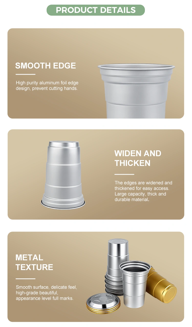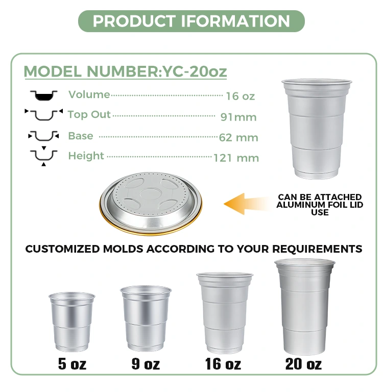 युंचू हा चीनचा 16oz डिस्पोजेबल कस्टम ॲल्युमिनियम फॉइल ड्रिंक कप निर्माता आहे. हा 16oz डिस्पोजेबल कस्टम ॲल्युमिनियम फॉइल ड्रिंकिंग कप हा 460-मिलिलिटर ॲल्युमिनियम फॉइल कप आहे जो कॉफी आणि बिअरसारख्या मानक पेयांसाठी योग्य आहे. हे प्रमाणित डिझाइन वैशिष्ट्यीकृत करते आणि मुख्यतः व्यावसायिक वापरकर्त्यांना लक्ष्य केले जाते जसे की कॉफी शॉप्स आणि क्राफ्ट बार सारख्या वारंवार सानुकूलनाच्या गरजा. कार्यक्षम उष्णता वाहक आणि मूलभूत सीलिंग कार्यप्रदर्शन प्रदान करताना, हा 16oz डिस्पोजेबल कस्टम रीसायकल करण्यायोग्य ॲल्युमिनियम फॉइल ड्रिंक कप जलद आणि लवचिक ब्रँड व्हिज्युअल कस्टमायझेशन सेवांवर देखील अधिक भर देतो.