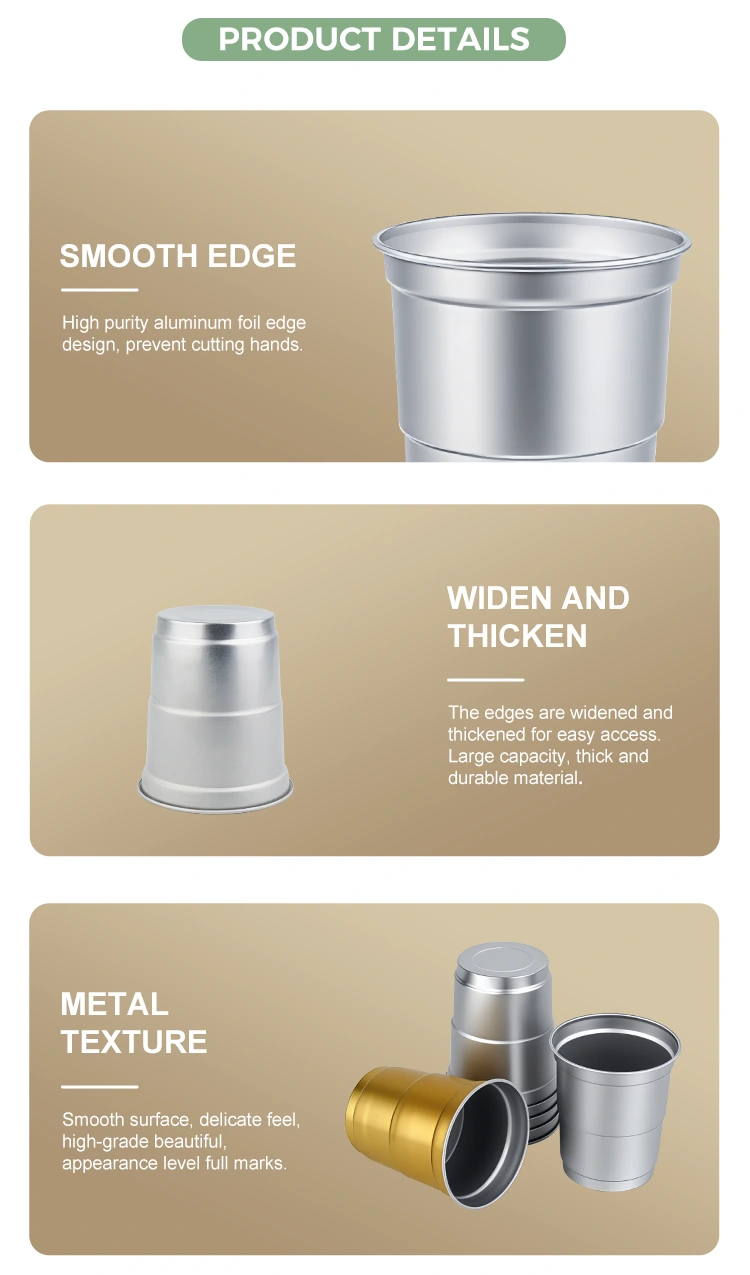 Yunchu ॲल्युमिनियम फॉइल पुरवठादाराचा 5oz डिस्पोजेबल रिसायकल करण्यायोग्य कोल्ड ड्रिंक ॲल्युमिनियम पेय कप, एक साधा आणि मोहक ॲल्युमिनियम धातूचा पोत, हा पेय कप विविध परिस्थितींसाठी योग्य बनवतो, ज्यामध्ये व्यावसायिक ऑपरेशन्स, फुरसतीचे मेळावे, मोठ्या प्रमाणात कार्यक्रम इत्यादीसारख्या अनेक क्षेत्रांचा समावेश होतो: स्केलेफिक सोल्यूशनसाठी, स्क्रिन तयार करण्यासाठी