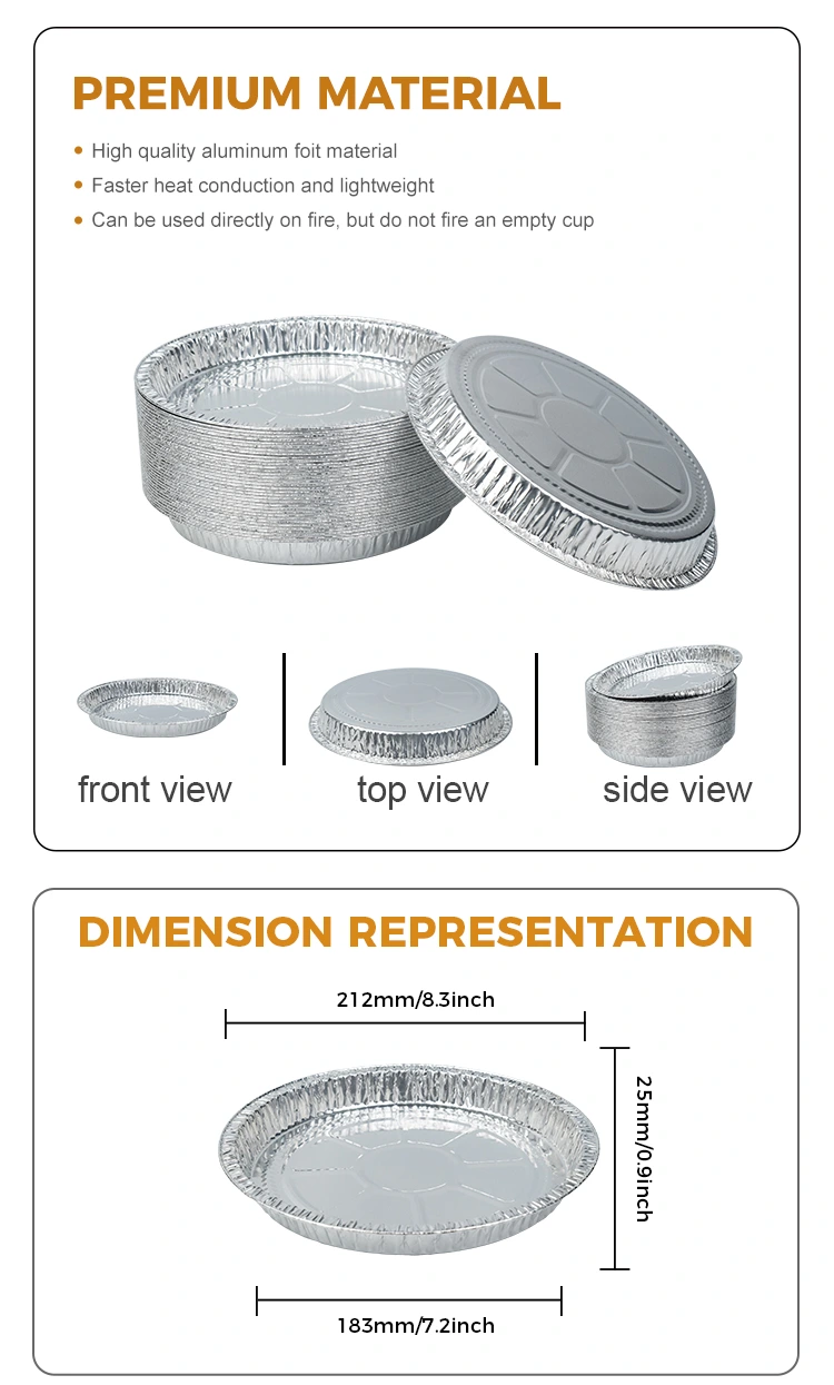 यंचू अॅल्युमिनियम फॉइल मॉडेल 1385 7-9 इंच पिझ्झा पॅन सिल्व्हर अ‍ॅल्युमिनियम फॉइल कंटेनर टॉप व्यास 212 मिमी (8.3 इंच), तळाशी व्यास 183 मिमी (7.2 इंच), उंची 25 मिमी (0.9 इंच). अंदाजे 680 मिली (23.9 औंस) क्षमतेसह, हे गुळगुळीत पृष्ठभाग, नॉन-स्टिकिंग, सुलभ रिलीझ आणि गंध नसलेल्या पिझ्झा आणि इतर बेक्ड वस्तू बेकिंगसाठी योग्य आहे. वाढवलेली धार डिझाइन घटकांना बाहेर पडण्यापासून प्रतिबंधित करते आणि बेकिंग कार्यक्षमता सुधारते. याव्यतिरिक्त, कंटेनर लोगो सानुकूलित सेवा प्रदान करू शकतो, जे ग्राहकांचे प्रभाव अधिक खोल करण्यास आणि ब्रँड प्रतिमा वाढविण्यात मदत करू शकते.