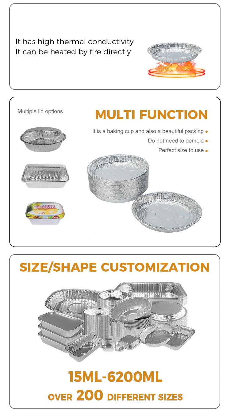 या उत्पादनाचा ट्रॅपीझॉइडल आकार केवळ व्हिज्युअल सौंदर्यच जोडत नाही, परंतु स्टोरेज स्पेसची बचत करून स्टॅक करणे आणि स्टोअर करणे देखील खूप सोपे आहे. त्याच वेळी, हे डिझाइन आयटममध्ये प्रवेश करणे सुलभ करते आणि फील्ड क्रियाकलापांमध्येही घसरणे सोपे नाही, जे वापराच्या सुरक्षिततेत मोठ्या प्रमाणात सुधारते. याव्यतिरिक्त, 7-9 इंच पिझ्झा पॅन सिल्व्हर अॅल्युमिनियम फॉइल कंटेनरमध्ये हलके डिझाइन आहे, ज्यामुळे ते मैदानी सहलीसाठी योग्य आहे. आपण हे कधीही, कोठेही, घरी असो किंवा घराबाहेर असो, कोणत्याही प्रसंगी सुलभ बनवितो.