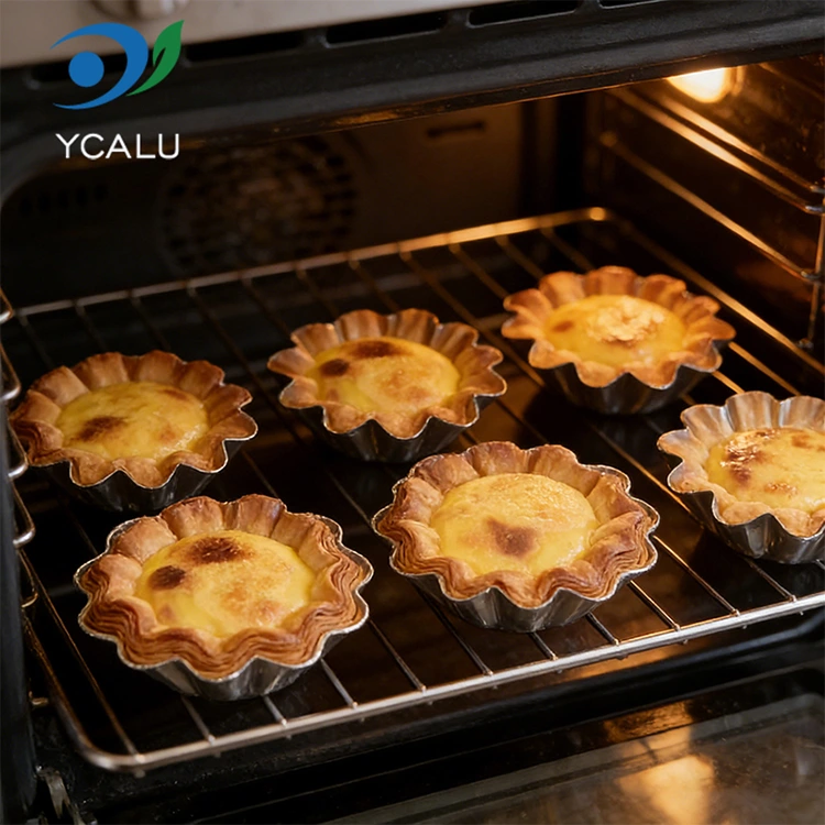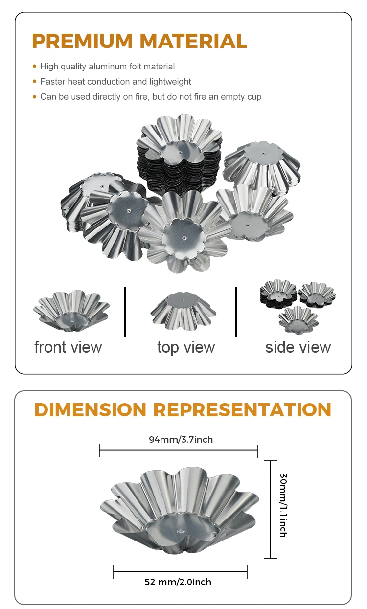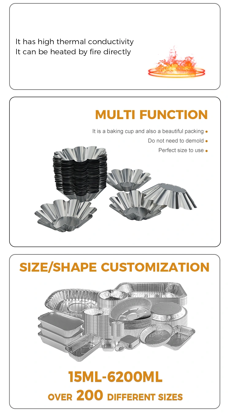 बाहेरील आणि सोयीस्कर दृश्ये: हलके आणि पोर्टेबल, मैदानी कॅम्पिंग, पिकनिक, पार्ट्या आणि इतर दृश्यांसाठी योग्य. अंडी टार्ट्स आणि स्नॅक्स आगाऊ तयार केले जाऊ शकतात आणि जड बेकिंग शीट न बाळगता कंटेनरमध्ये ठेवू शकतात. ते खाल्ल्यानंतर थेट टाकून दिले जाऊ शकतात. ते स्वच्छ करणे सोपे आहे आणि जागा घेत नाही. हे टेकआउट पॅकेजिंगसाठी देखील वापरले जाऊ शकते. ॲल्युमिनियम फॉइल सामग्रीचे सीलिंग आणि उष्णता संरक्षण गुणधर्म प्रभावीपणे तापमान आणि मिठाईची चव टिकवून ठेवू शकतात आणि वाहतुकीदरम्यान गळती आणि विकृती टाळू शकतात.