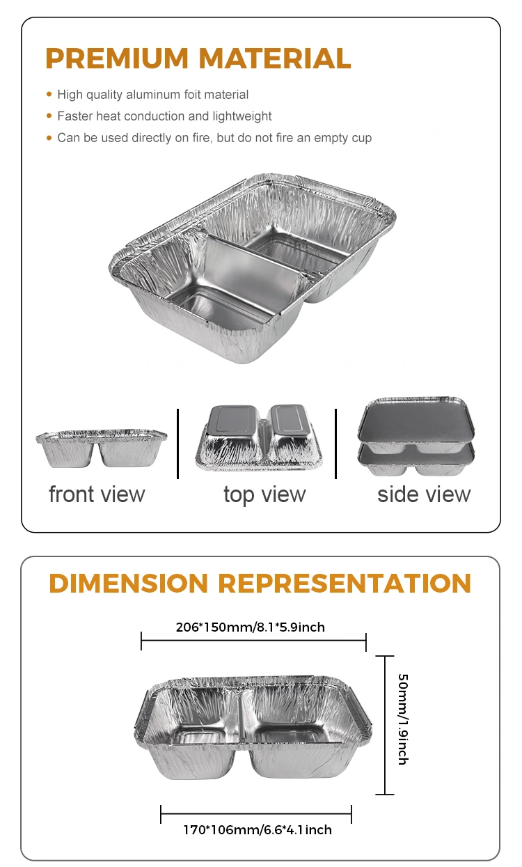 या डिस्पोजेबल कंपार्टमेंट फास्ट फूड सिल्व्हर अ‍ॅल्युमिनियम फॉइल कंटेनरचा सुरुवातीचा आकार अन्न आत आणि बाहेर ठेवणे सोपे आहे. अन्नाची सेवा देताना, मोठ्या ओपनिंगमुळे स्वयंपाकघरातील कर्मचार्‍यांना त्यामध्ये द्रुत आणि उच्च-गुणवत्तेचे ढीग-तळलेले डिश आणि इतर वस्तू ओतण्याची परवानगी मिळते आणि ग्राहकांना खाऊन हाताळणे देखील सोपे आहे, जसे की चॉपस्टिक किंवा काटेसह अन्न उचलणे. या डिझाइनची उंची पुरेशी अन्न क्षमता सुनिश्चित करताना लंच बॉक्सची स्थिरता सुनिश्चित करू शकते आणि वाहतुकीच्या वेळी किंवा प्लेसमेंट दरम्यान अत्यधिक उंचीमुळे सहजपणे टाकले जाणार नाही, ज्यामुळे आतल्या अन्नाचे स्पिलिंगपासून प्रभावीपणे संरक्षण मिळेल.