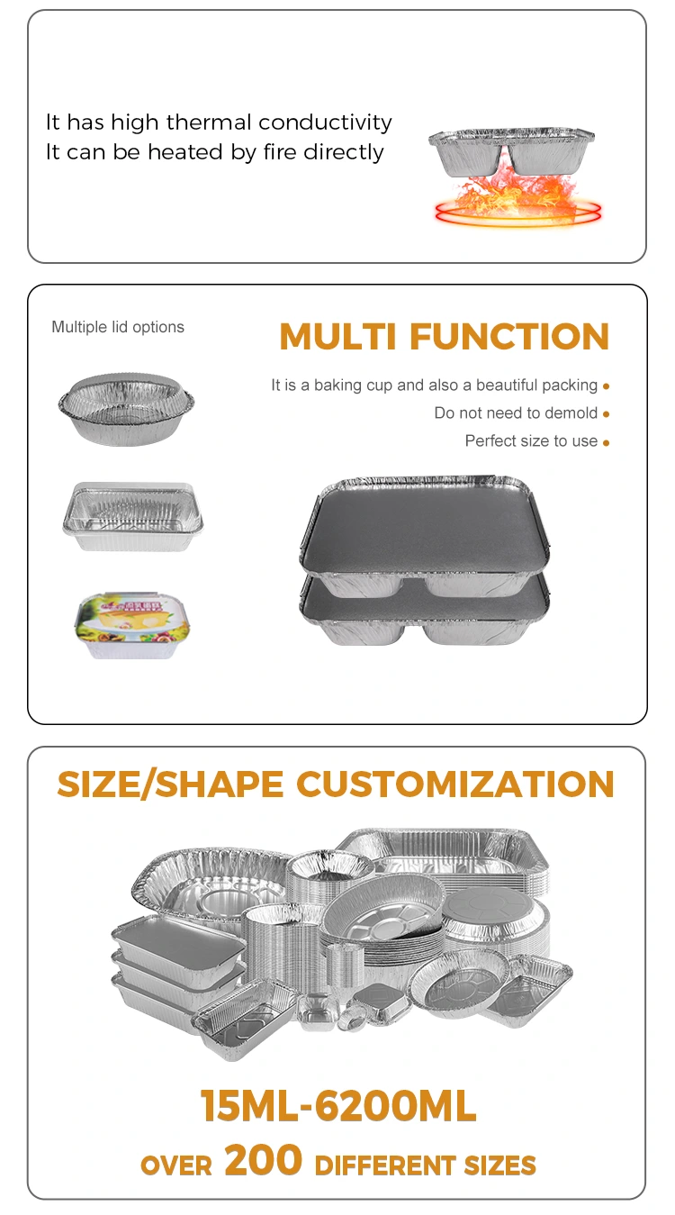 यंचू uminum ल्युमिनियम फॉइल सप्लाय फॅक्टरीचा डिस्पोजेबल कंपार्टमेंट फास्ट फूड सिल्व्हर अ‍ॅल्युमिनियम फॉइल कंटेनर मॉडेल 75600 आहे, वरचा व्यास 206 मिमी (8.1 इंच), 150 मिमी (5.9 इंच), तळाशी व्यास 170 मिमी (6.6 इंच), 106 मिमी (1.१ इंच) (1.१ इंच) (१.). क्षमता अंदाजे 860 मिली (30.3 औंस) आहे. या अॅल्युमिनियम फॉइल लंच बॉक्समध्ये केवळ उत्कृष्ट उष्णता कायम नाही तर अ‍ॅल्युमिनियम फॉइलच्या झाकणासह देखील जोडले जाऊ शकते. याव्यतिरिक्त, आम्ही ग्राहक मेमरी सखोल करण्यासाठी आणि ब्रँड जागरूकता वाढविण्यासाठी सानुकूलित लोगो सेवा देखील प्रदान करतो.