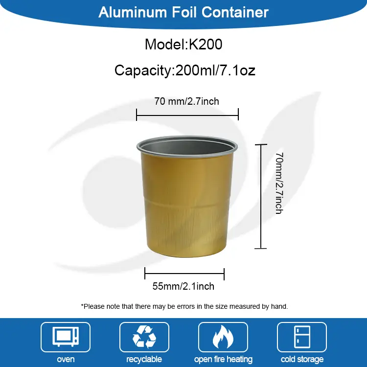 यंचू अ‍ॅल्युमिनियम फॉइल सप्लाय फॅक्टरीद्वारे पुरविल्या जाणार्‍या मॉडेल के 200 डिस्पोजेबल पोर्टेबल कॉफी पिण्याचे कपचा वरचा व्यास 70 मिमी (सुमारे 2.7 इंच), कमी व्यासाचा 55 मिमी (सुमारे 2.1 इंच) आणि 70 मिमी उंची (सुमारे 2.7 इंच) आहे. क्षमता सुमारे 200 मिली (सुमारे 4.2 औंस) आहे. हा डिस्पोजेबल कॅम्पिंग कॉफी ड्रिंक कप विविध प्रसंगी योग्य आहे, जसे की व्यवसाय क्रियाकलाप, कॅम्पिंग, कौटुंबिक मेळावे इत्यादी, जे व्यावहारिक आणि सुंदर दोन्ही आहेत, जे आपल्यासाठी उच्च दर्जाचे जीवन जगतात. कप एक समान रीतीने उष्णता नष्ट करण्यासाठी आणि हाताच्या जळजळ टाळण्यासाठी जाड कोटिंगसह डिझाइन केलेले आहे.