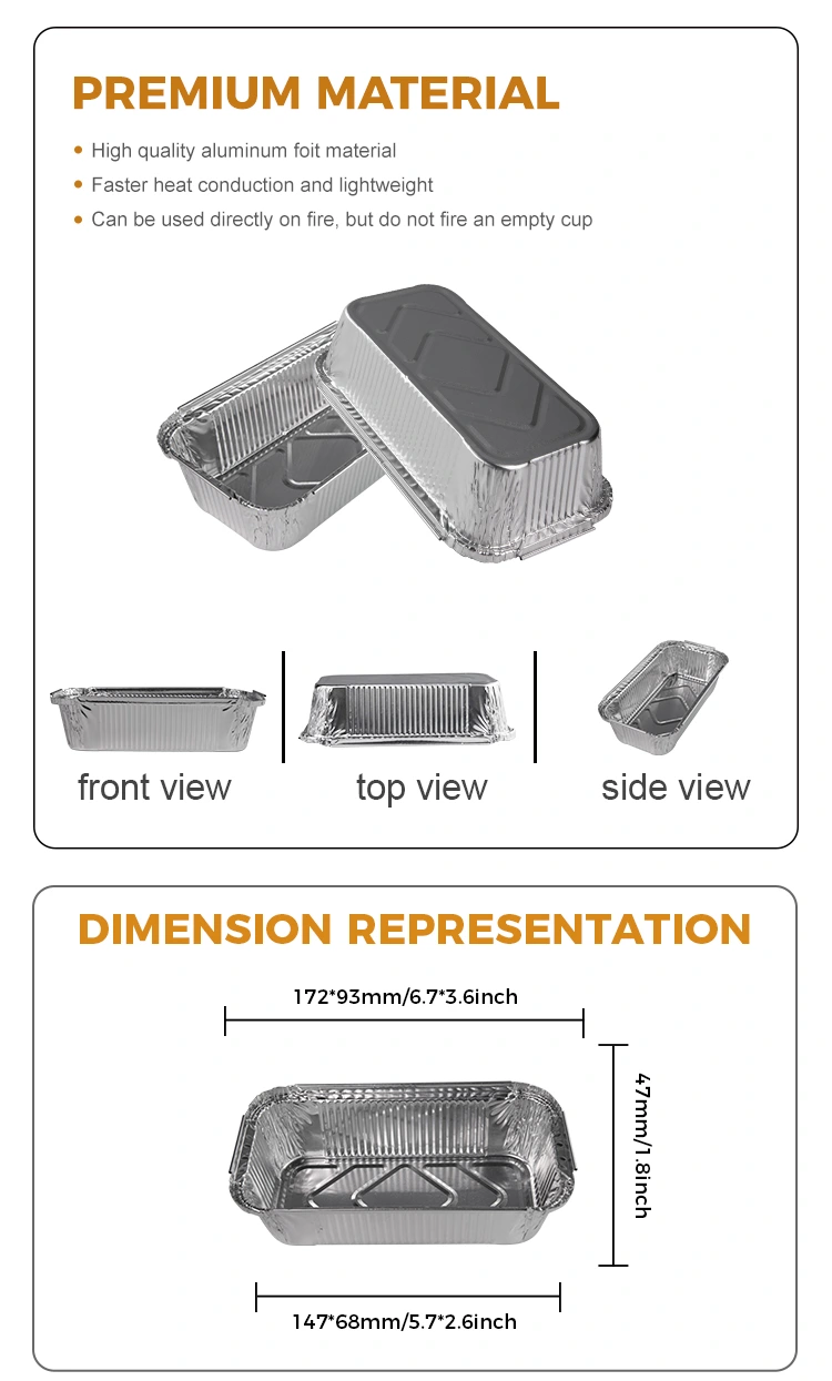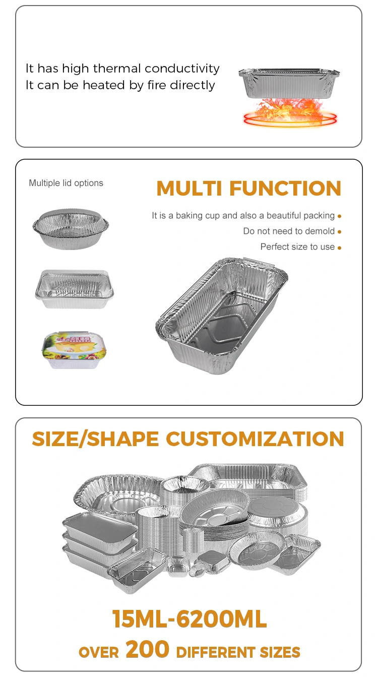 यंचू अ‍ॅल्युमिनियम फॉइल पुरवठादार कडून डिस्पोजेबल आयताकृती बेकिंग सिल्व्हर अ‍ॅल्युमिनियम फॉइल कंटेनर हे ग्रिलिंग, हॉट पॉट, ग्रेटिन, टेकवे पॅकेजिंग आणि बरेच काही यासारख्या विविध स्वयंपाक पद्धतींसाठी योग्य स्वयंपाकघर साधन आहे. हा कंटेनर विविध भांडी आणि उपकरणे बसविण्यासाठी पुरेसा संक्षिप्त आहे आणि वेगवेगळ्या ओपन फ्लेम बार्बेक्यूजच्या गरजा भागविण्यासाठी विविध आकारात येतो. It can be used to make various food products, such as air fryers and other equipment applications, heat and oil resistance, easy baking.