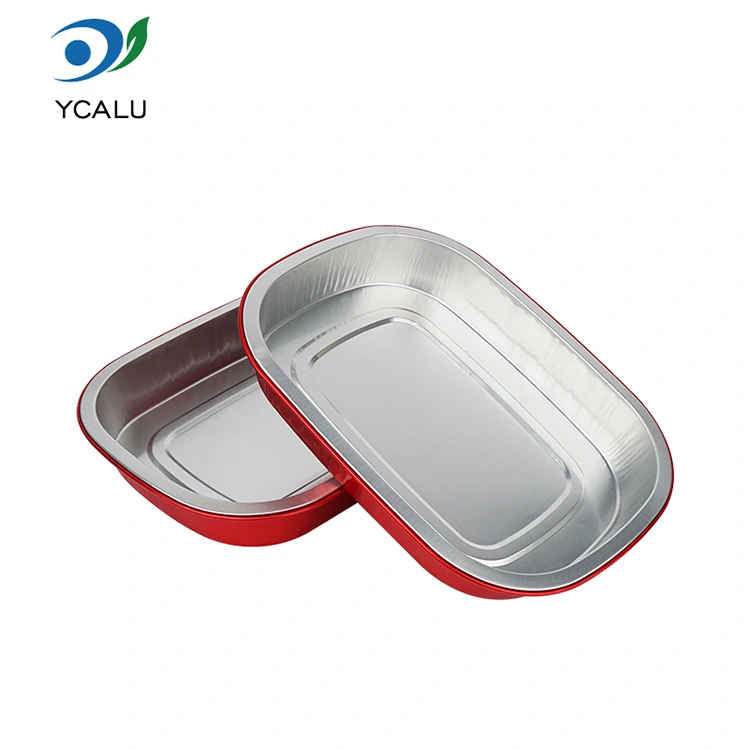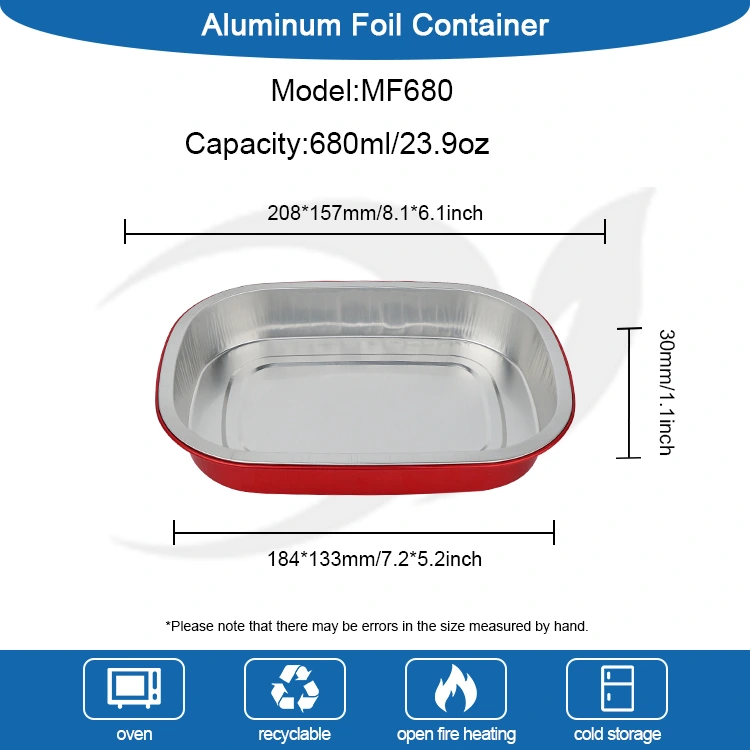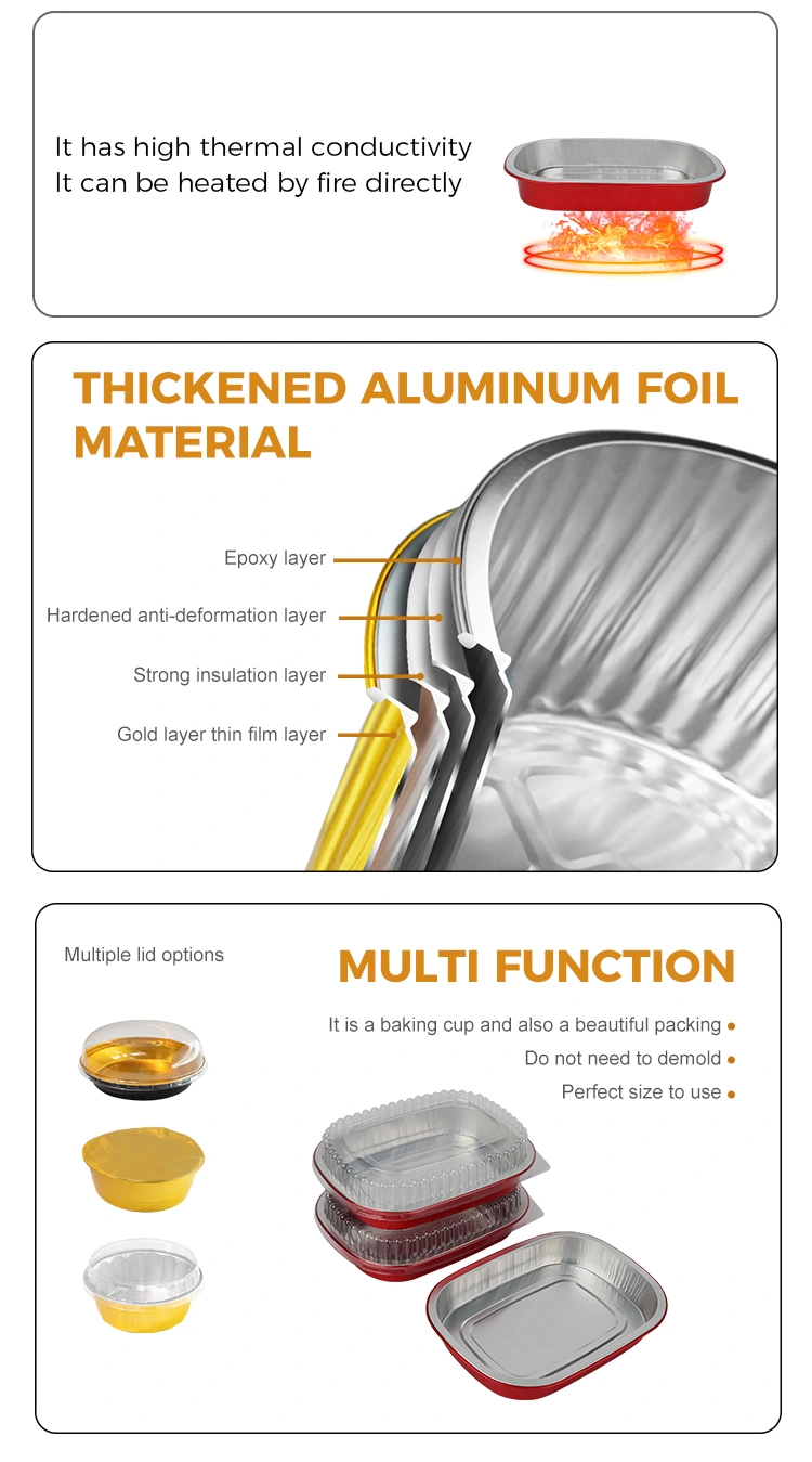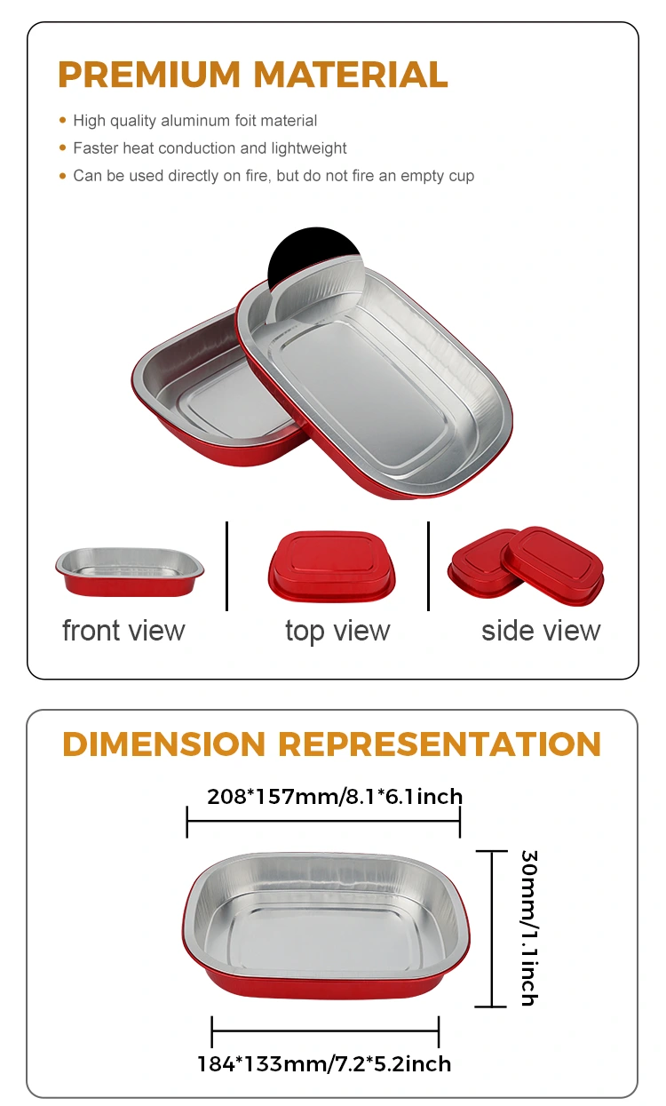 युंचू हा चीनमधील ॲल्युमिनियम फॉइल कंटेनरचा व्यावसायिक निर्माता आणि पुरवठादार आहे. डिस्पोजेबल रेड लंच बॉक्स स्क्वेअर ॲल्युमिनियम फॉइल कंटेनर्स आम्ही तुमच्यासाठी 208*157 मिलीमीटर (8.1*6.1 इंच) व्यासाचे आहेत. खालचा व्यास 184*133 (7.2*5.2 इंच), उंची 30 (1.1 इंच) आहे आणि क्षमता अंदाजे 680 मिलीलीटर (23.9OZ) आहे. हे फूड-ग्रेड 8011 फूड-ग्रेड ॲल्युमिनियम फॉइल जाड बेस मटेरियल स्वीकारते, जे कडकपणा आणि भार सहन करण्याची क्षमता दोन्ही विचारात घेते, विकृत करणे किंवा गळती करणे सोपे नाही आणि अन्नाला थेट आधार देऊ शकते. हे -20 ℃ ते 220 ℃ च्या अल्ट्रा-वाइड तापमान श्रेणीशी सुसंगत आहे. डिमोल्डिंगची आवश्यकता नाही. ते थेट ओव्हन, एअर फ्रायर किंवा स्टीमरमध्ये वापरण्यासाठी ठेवले जाऊ शकते आणि संरक्षणासाठी रेफ्रिजरेट केले जाऊ शकते. हे "बेकिंग - स्टोरेज - वापर - विल्हेवाट" चा एक-स्टॉप सोयीस्कर अनुभव देते. ॲल्युमिनियम फॉइलचा मुख्य फायदा म्हणजे त्याची उच्च थर्मल चालकता. सोनेरी कोटिंग उष्णता गोळा करण्यास मदत करते, अन्न समान रीतीने आणि त्वरीत गरम होते याची खात्री करते.
