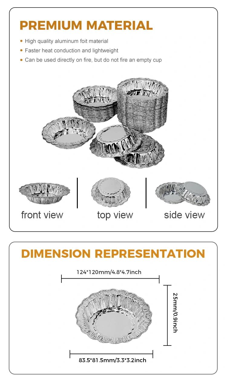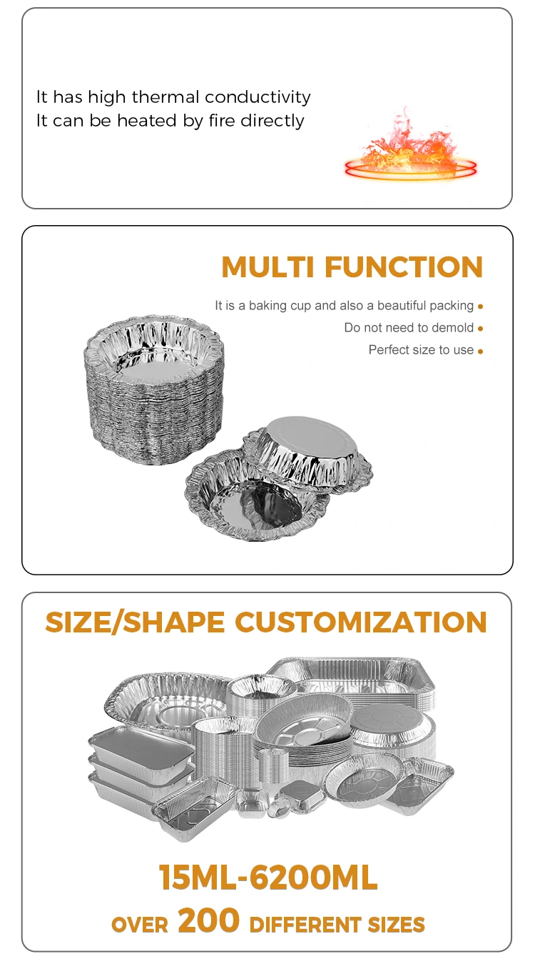 यंचू अॅल्युमिनियम फॉइल आपल्याला लेस गोल बेकिंग केक सिल्व्हर अ‍ॅल्युमिनियम फॉइल कंटेनर बेकिंग आणि स्टीमिंगसाठी अष्टपैलू आहे. हे एकाधिक उपयोगांसाठी डिझाइन केलेले आहे, केक, वाटीचे केक आणि इतर विविध पदार्थ बनवण्यास सक्षम आहे. हे डिस्पोजेबल आहे, साफसफाईची आवश्यकता नाही आणि बर्निंग किंवा ब्रेकिंग न करता -30 ℃ ते 250 ℃ पर्यंत उच्च तापमानाचा प्रतिकार करू शकतो. जाड, उच्च-गुणवत्तेची, अन्न-ग्रेड आणि पर्यावरणास अनुकूल सामग्रीपासून बनविलेले, हानिकारक पदार्थांशिवाय वापरणे अधिक सुरक्षित आहे. हे नुकसान, बळकट आणि टिकाऊ, मजबूत तन्य शक्ती आणि चांगले वाढविण्यास प्रतिरोधक आहे, तर कडा कट टाळण्यासाठी गुळगुळीत आहेत. विविध बेकिंग गरजा भागविण्यासाठी विविध वैशिष्ट्ये उपलब्ध आहेत.