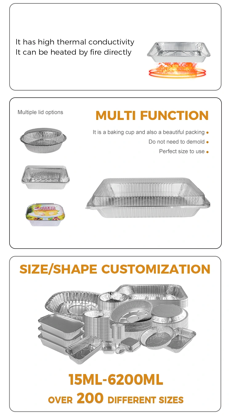 वैशिष्ट्ये: ही मोठी क्षमता मैदानी बेकिंग पॅन सिल्व्हर फॉइल कंटेनर अन्न-ग्रेड 8011-0 अॅल्युमिनियम फॉइल सामग्रीपासून बनविली जाते, जी अन्न-ग्रेड संपर्क मानक पूर्णपणे पूर्ण करते, विचित्र वास न करता अन्नाची सुरक्षा सुनिश्चित करते आणि वापरण्यासाठी अधिक आश्वासन देते. यात एक अवतल आणि बहिर्गोल अंतर्गत डिझाइन आहे, जे वापरण्यास अधिक सुरक्षित आहे. उपकरणे साफसफाईपासून मुक्त आहेत आणि उपकरणे लाइनरचे चांगले संरक्षण करतात. खुल्या ज्योतवर बेकिंग किंवा गरम करणे असो, कंटेनरच्या विकृतीची चिंता करण्याची किंवा अन्नाच्या सुरक्षिततेवर परिणाम करण्याची आवश्यकता नाही.