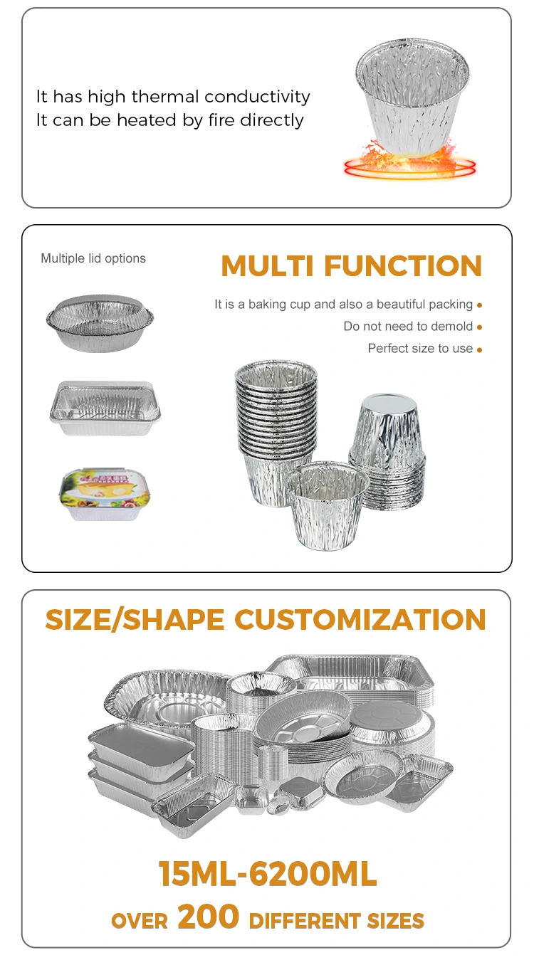 युंचू ॲल्युमिनियम फॉइल सप्लायर डिस्पोजेबल बेकिंग केक सिल्व्हर ॲल्युमिनियम फॉइल कंटेनर फूड ग्रेड ॲल्युमिनियम फॉइल सामग्री, घट्ट केलेले साहित्य मोठ्या प्रमाणात उत्पादनाची स्थिरता सुनिश्चित करण्यासाठी लीक-प्रूफ आणि कॉम्प्रेसिव्ह आहे. उष्णता वहन सम आणि जलद आहे, बेकिंगचा वेळ कमी करते आणि जेवण वितरण कार्यक्षमता सुधारते. इंटिग्रेटेड बेकिंग आणि पॅकलोडिंग स्टेप आणि पॅकलोडिंग डिझाईन कमी करते. मजुरीचा खर्च कमी करते. अनेक तपशील उपलब्ध आहेत, विविध लहान मिष्टान्नांच्या उत्पादनासाठी योग्य आहेत, आणि टेकआउट वाहतुकीदरम्यान सहजपणे विकृत होत नाहीत, ज्यामुळे ब्रँडची प्रतिष्ठा वाढविण्यात मदत होते.