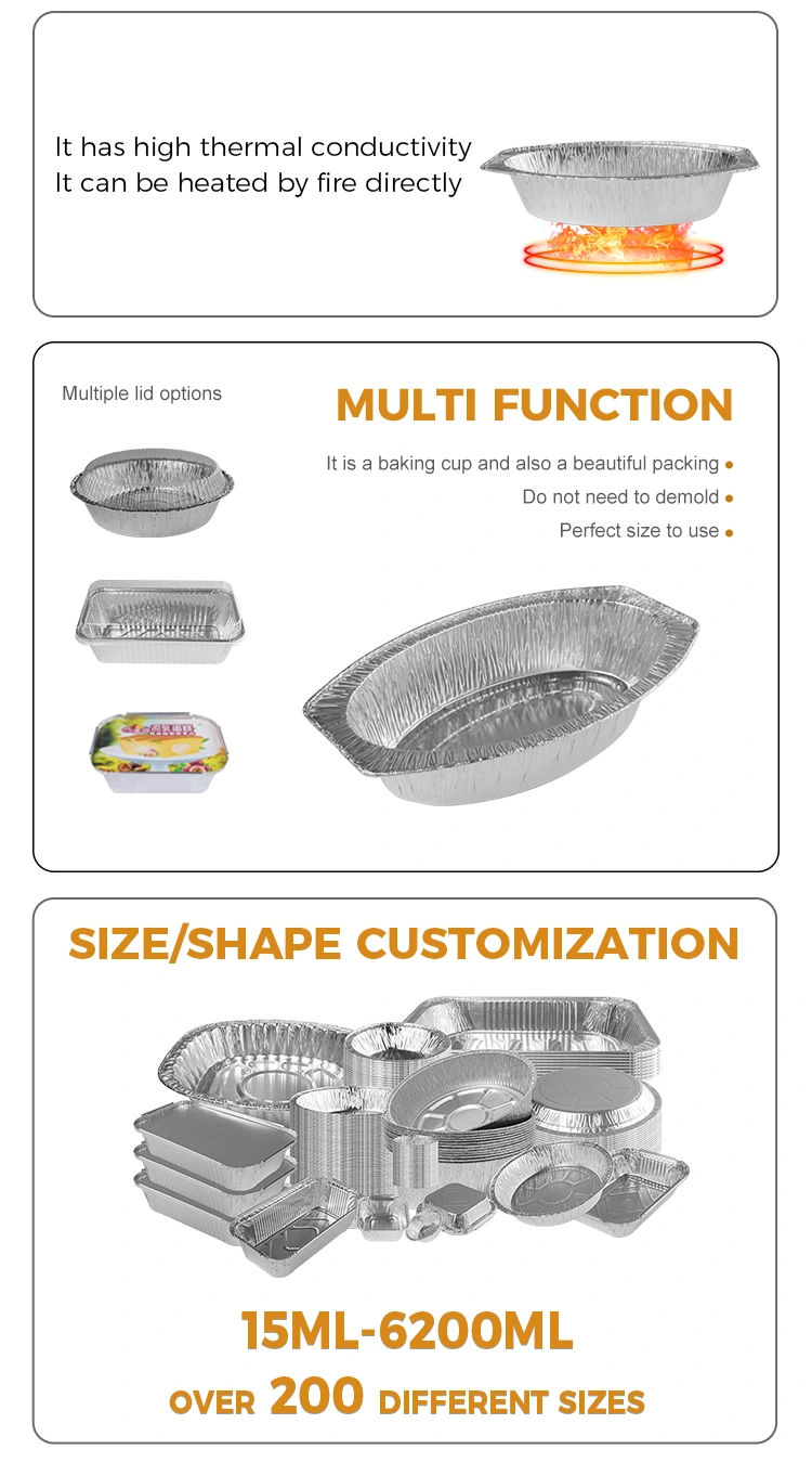 यंचू uminum ल्युमिनियम फॉइल पुरवठादार घरातील स्वयंपाक, बेकरी, साखळी स्टोअर आणि रेफ्रिजरेटेड फूड डिलिव्हरीसाठी ओव्हल बेक्ड ब्रेड सिल्व्हर अ‍ॅल्युमिनियम फॉइल कंटेनर ऑफर करते. फूड-ग्रेड अ‍ॅल्युमिनियम फॉइल मटेरियलपासून तयार केलेल्या या कंटेनरमध्ये एक अनोखा अंडाकृती आकार आहे ज्यामुळे तो चांदीच्या अनेक बेकिंग बॉक्समध्ये उभे राहतो. हा कंटेनर विशेषत: गरम रुमाल, फळे, ब्रेड आणि सर्व प्रकारच्या रीटॉर्ट पदार्थ ठेवण्यासाठी योग्य आहे आणि टेबलवेअरच्या विस्तृत श्रेणीच्या गरजा भागवू शकतो. त्याच्या चांगल्या थर्मल चालकतेमुळे, ते समान प्रमाणात तापमान कमी करते, हे सुनिश्चित करते की अन्न समान रीतीने गरम होते. याव्यतिरिक्त, त्यात एक विशिष्ट लोड-बेअरिंग क्षमता आणि दबाव प्रतिरोध आहे, एकाधिक स्टॅकच्या बाबतीतही स्थिरता राखणे, विकृती रोखणे आणि वाहतुकीदरम्यान वापरण्यासाठी आदर्श आहे. वेगवेगळ्या परिस्थिती आणि गरजा चांगल्या प्रकारे अनुकूल करण्यासाठी, हा कंटेनर ग्राहकांच्या आवश्यकतेनुसार सानुकूलित केला जाऊ शकतो आणि अतिरिक्त व्यावहारिकतेसाठी जुळणारे झाकण प्रदान करू शकतो.