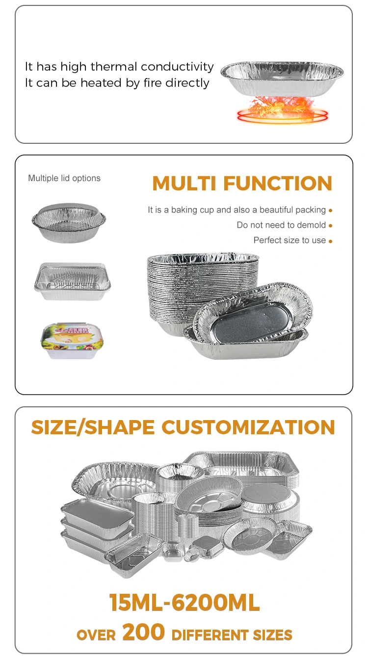 त्याच्या लहान आणि हलके डिझाइनमुळे, हे अंडाकृती भाजलेले चांदीचे अ‍ॅल्युमिनियम फॉइल फूड कंटेनर अन्न वाहून नेण्यासाठी आणि साठवणुकीसाठी योग्य आहे, स्टोअर, फास्ट फूड रेस्टॉरंट्स आणि बरेच काही फूड स्टोअरच्या वापरासाठी आणि सानुकूलनासाठी योग्य आहे. तळाशी अवतल आणि बहिर्गोल पोत डिझाइन घर्षण वाढविण्यात आणि उष्णता समान रीतीने वितरीत करण्यास आणि स्थानिक ओव्हरहाटिंग टाळण्यास मदत करते. याव्यतिरिक्त, कॉम्प्रेशन प्रतिरोध आणि टिकाऊपणा सुधारण्यासाठी अ‍ॅल्युमिनियम फॉइल बॉक्स दाट केला गेला आहे आणि वाहतुकीच्या वेळीही ते स्थिर राहू शकते आणि विकृत करणे सोपे नाही.
