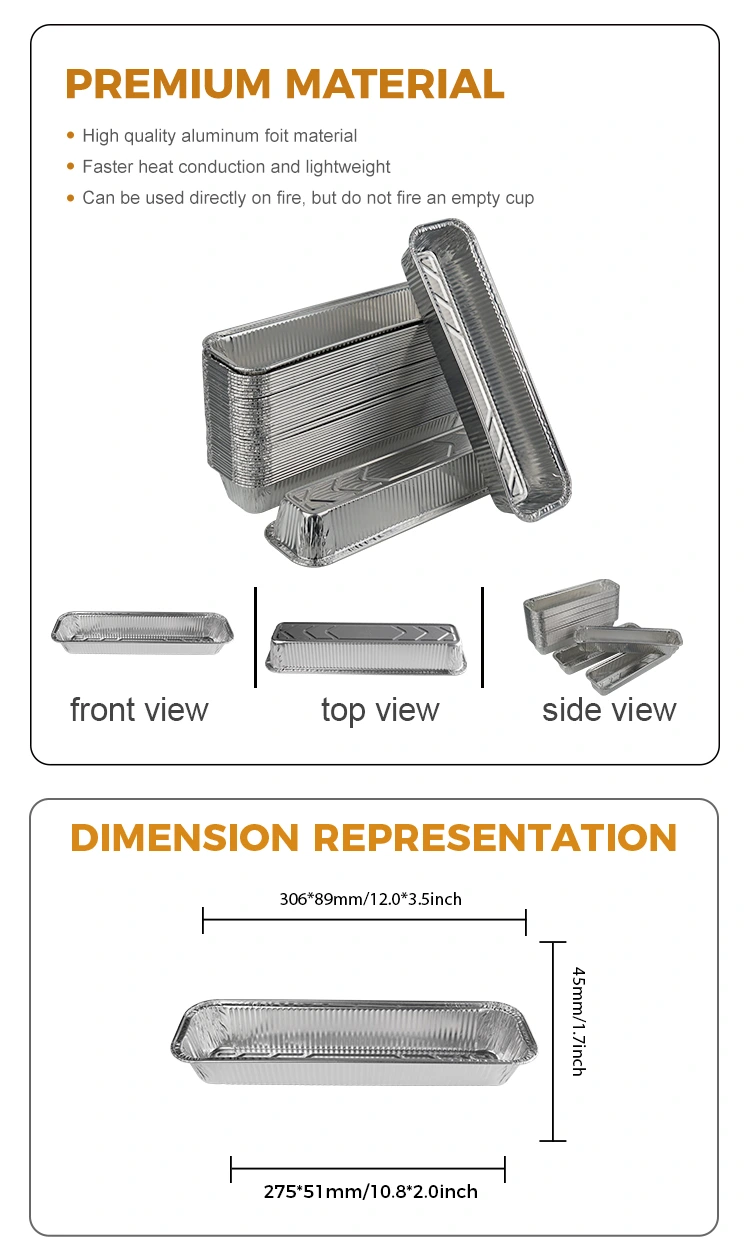 युंचु uminum ल्युमिनियम फॉइल पुरवठादाराद्वारे प्रदान केलेले आयताकृती ब्रेड ट्रे बेकिंग सिल्व्हर अ‍ॅल्युमिनियम फॉइल कंटेनर अन्न-ग्रेड सामग्रीचे बनलेले आहे आणि विविध प्रकारच्या अनुप्रयोगांसाठी योग्य आहे. हे उत्पादन विशेषतः ग्रीलिंग आणि बेकिंगच्या उद्देशाने योग्य आहे, जसे की ब्रेडच्या लांब भाकरी किंवा बेकिंग करणे. ते कोळशाच्या ग्रिलिंगसाठी असो किंवा टेकवे डिलिव्हरी बॉक्स म्हणून, ते वापरण्यासाठी योग्य आहे.