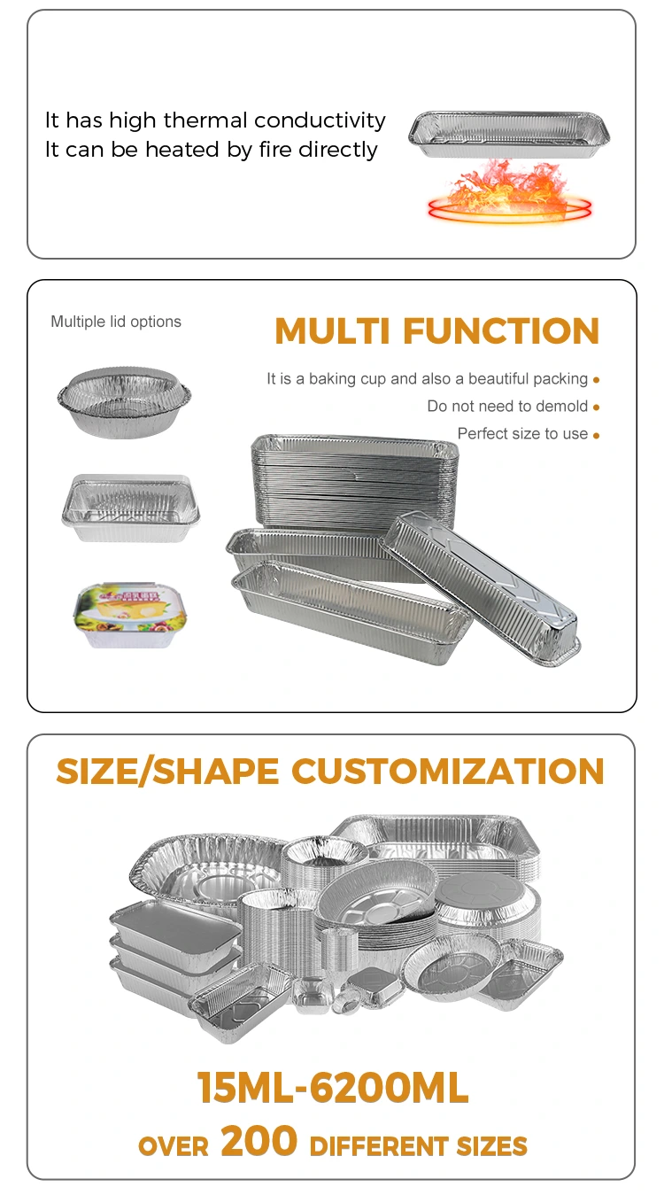 वैशिष्ट्ये: आयताकृती ब्रेड ट्रे बेकिंग सिल्व्हर अ‍ॅल्युमिनियम फॉइल कंटेनर निरोगी, पर्यावरणास अनुकूल, अन्न-ग्रेड सामग्री, सुरक्षित आणि नॉन-विषारी, नूतनीकरणयोग्य आणि पर्यावरणास अनुकूल सामग्री, अन्न सुरक्षेवर जोर देणे आणि एकूण उत्पादनाची गुणवत्ता.