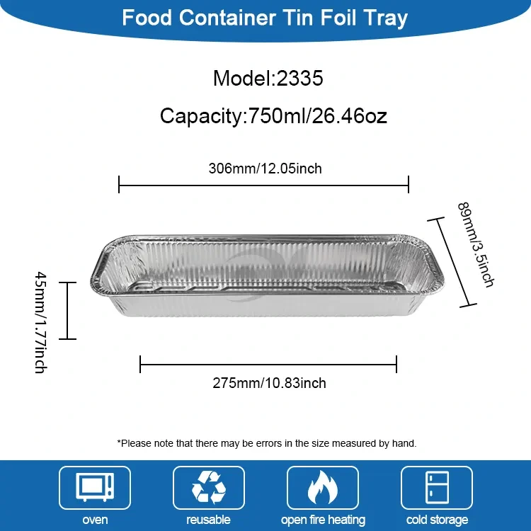 या आयताकृती ब्रेड ट्रे बेकिंग सिल्व्हर अ‍ॅल्युमिनियम फॉइल कंटेनरमध्ये कठोर गुणवत्ता चाचणी घेते जेणेकरून हे सुनिश्चित होते की ओपन फ्लेम हीटिंग दरम्यान कोणतेही हानिकारक पदार्थ सोडले जात नाहीत आणि वापरकर्त्यांना सुरक्षिततेच्या समस्यांविषयी चिंता करण्याची आवश्यकता नाही. याव्यतिरिक्त, त्याची पर्यावरणास अनुकूल आणि टिकाऊ डिझाइन केवळ उत्पादनांच्या सुरक्षित वाहतुकीचीच हमी देत ​​नाही तर उत्कृष्ट देखावा देखील राखते. तळाशी अवतल आणि उत्तल डिझाइन उत्पादनाच्या अँटी-स्लिप गुणधर्मांमध्ये वाढ करते, तर बाजूंनी जोडलेल्या स्टिफनर्स उत्पादनाची कडकपणा वाढवते. चांगले तापमान प्रतिकार आणि थर्मल चालकतेसह हेमिंग डिझाइन जाड आणि सखोल केले जाते, जे एकसमान गरम होऊ शकते आणि विचित्र वास येऊ शकत नाही, ज्यामुळे कोळशाच्या ग्रिलिंग, लांब ब्रेड आणि टेकवे डिलिव्हरी सारख्या अनेक परिस्थितींमध्ये वापरण्यासाठी ते योग्य आहे.