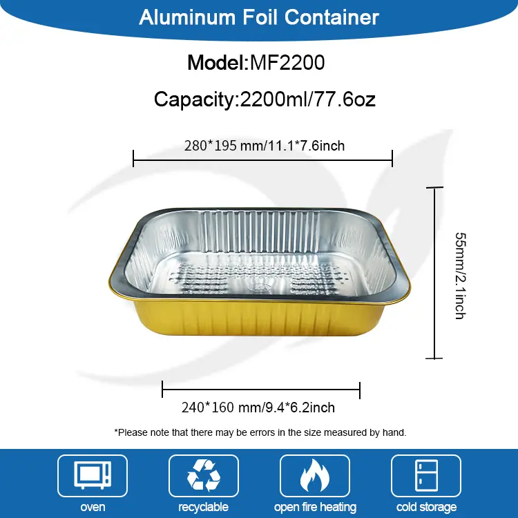 आयताकृती सोन्याचे अॅल्युमिनियम फॉइल कंटेनर एमएफ 2200 वरचा व्यास 278*195 मिमी (10.9*7.6 इंच) आहे, खालचा व्यास 240*160 मिमी (9.4*6.2 इंच) आहे, उंची 55 मिमी (2.1 इंच) आहे आणि क्षमता सुमारे 2200 एमएल (77.6 औंस) आहे.