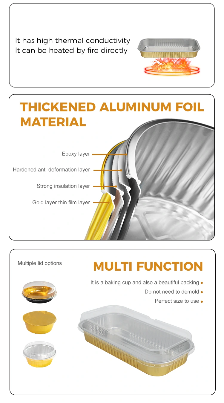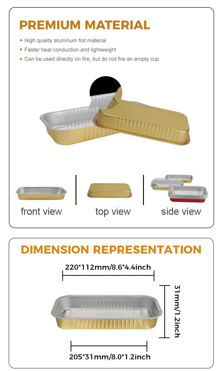 युंचू ॲल्युमिनियम फॉइल आयताकृती सोनेरी बेक स्मूथवॉल ॲल्युमिनियम फॉइल कंटेनर प्रदान करते, जे केवळ बेकिंग परिस्थितीसाठीच नाही तर टेकआउटसाठी देखील योग्य आहेत आणि दैनंदिन स्टोरेजमध्ये देखील तुम्हाला मदत करू शकतात: