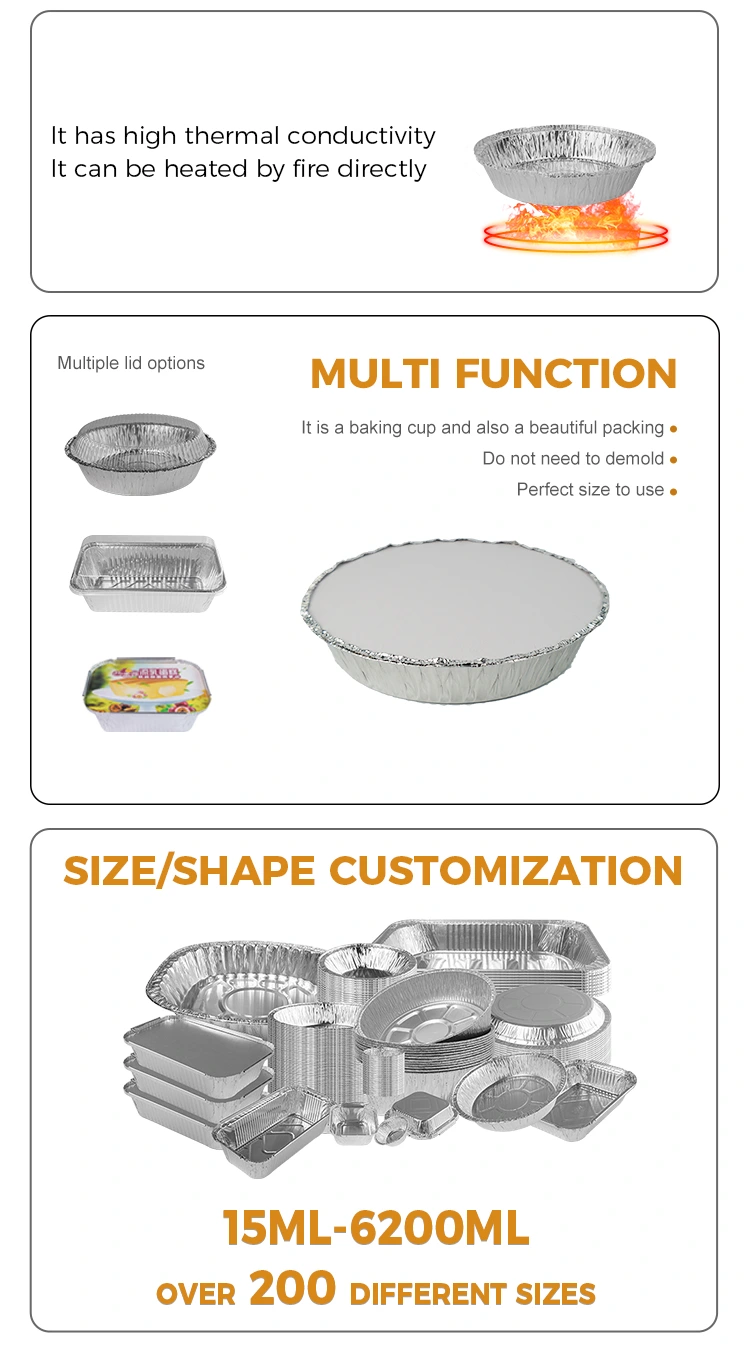वैशिष्ट्ये: एक-तुकडा मोल्डिंग जाड आणि बेक्ड-प्रतिरोधक, फूड कॉन्टॅक्ट ग्रेड अ‍ॅल्युमिनियम फॉइल सामग्रीचा अवलंब करणे, अन्नाशी संपर्क साधण्याचे आश्वासन, विकृत करणे सोपे नाही आणि गळती नाही, मजबूत जाडी, गंज प्रतिकार, उच्च तापमान प्रतिकार.