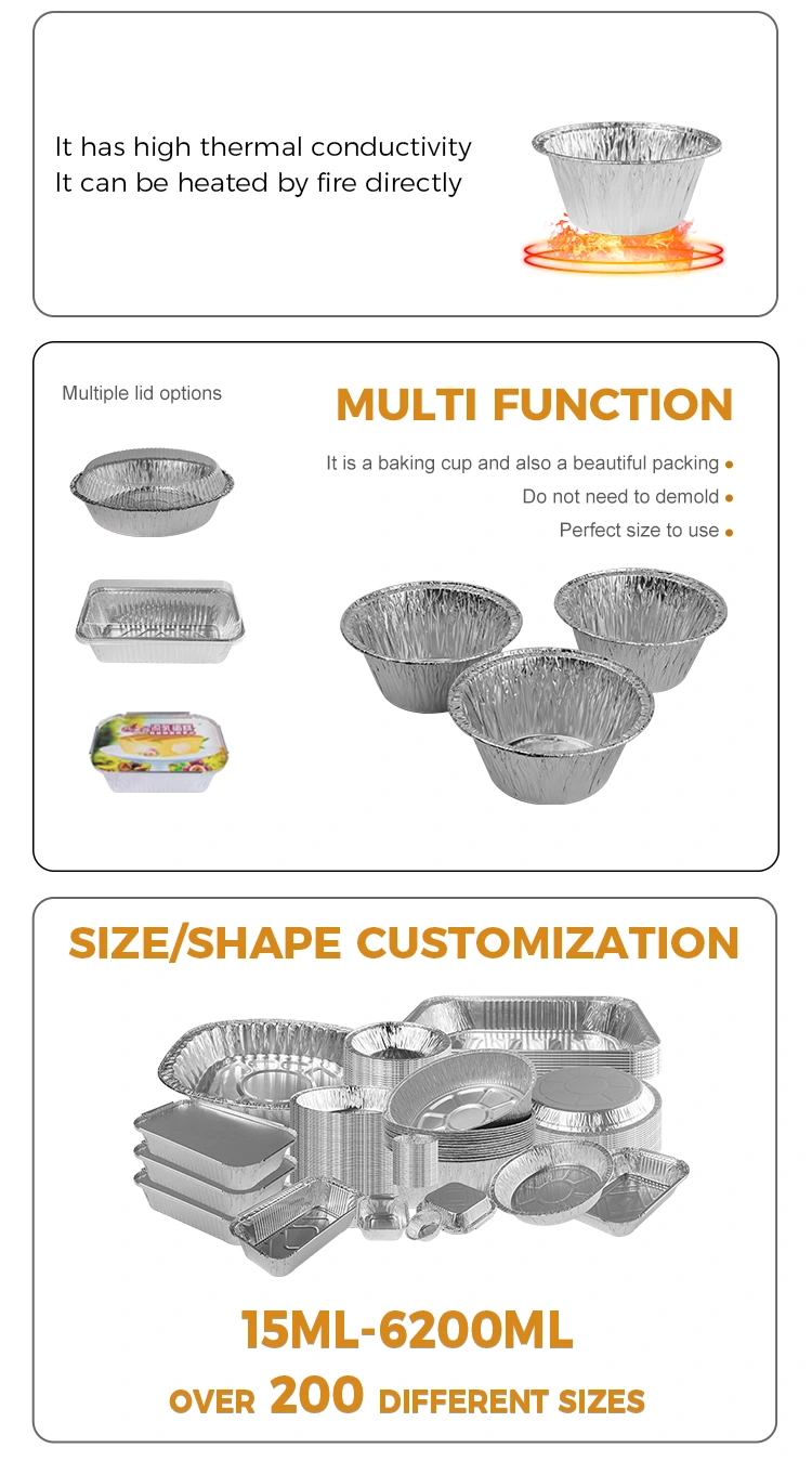 कंटेनर त्याच्या सभोवतालच्या आकाराच्या आकारासह डिझाइन केलेले आहे, जे कंटेनरच्या सौंदर्यशास्त्रात घेणे सुलभ करते आणि जोडणे सुलभ करते. ते बेकिंग केक्स, ब्रेड किंवा इतर पेस्ट्री असो, हे फॉइल कंटेनर आपल्याला परिपूर्ण संरक्षण आणि सोयीसह प्रदान करते.