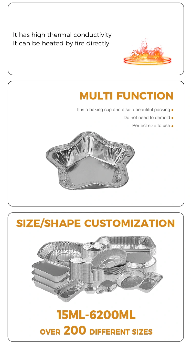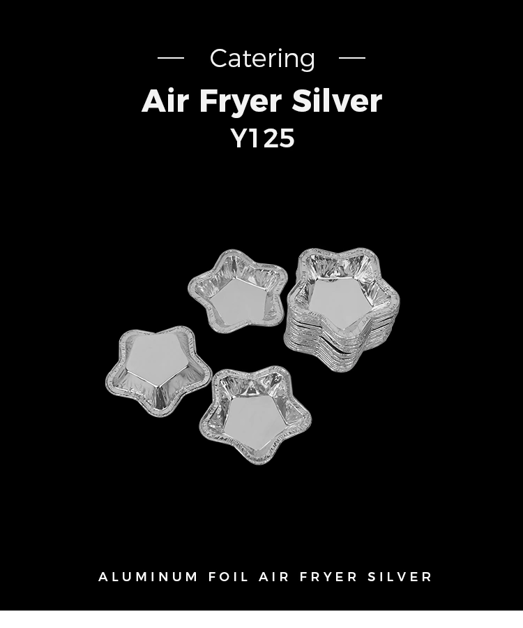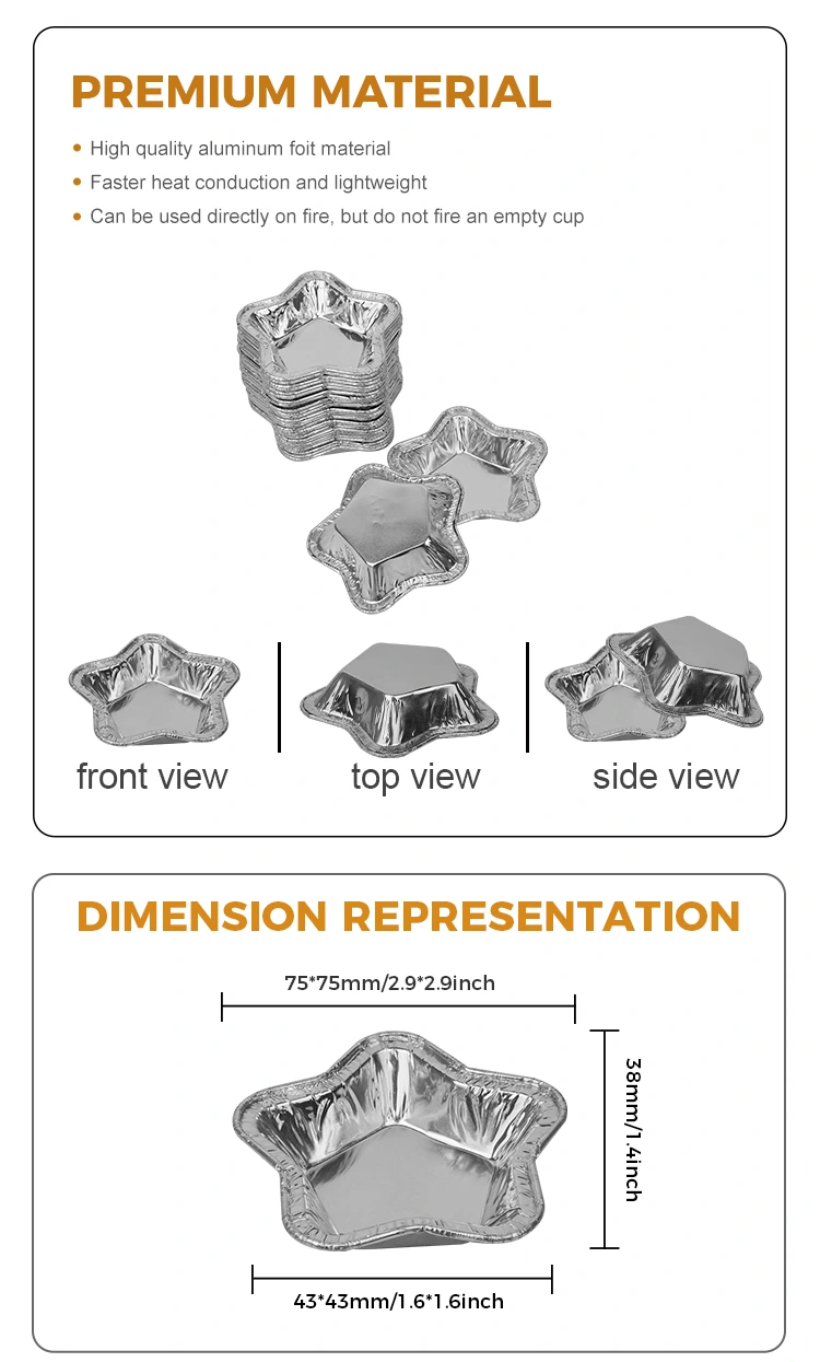 तारेच्या आकाराचे ॲल्युमिनियम फॉइल टार्ट कप चांदीच्या ॲल्युमिनियम फॉइलचे बनलेले असतात आणि उच्च-तापमान प्रतिरोधक असतात, ते -20°C आणि 300°C दरम्यान स्थिर राहतात. ते बेकिंग आणि एअर फ्रायर वापरण्यासाठी योग्य आहेत आणि उपकरणाच्या आतील भिंतींना होणारे नुकसान टाळू शकतात. ते डिस्पोजेबल आहेत, त्यांना सोयीस्कर बनवतात कारण साफसफाईची आवश्यकता नाही.